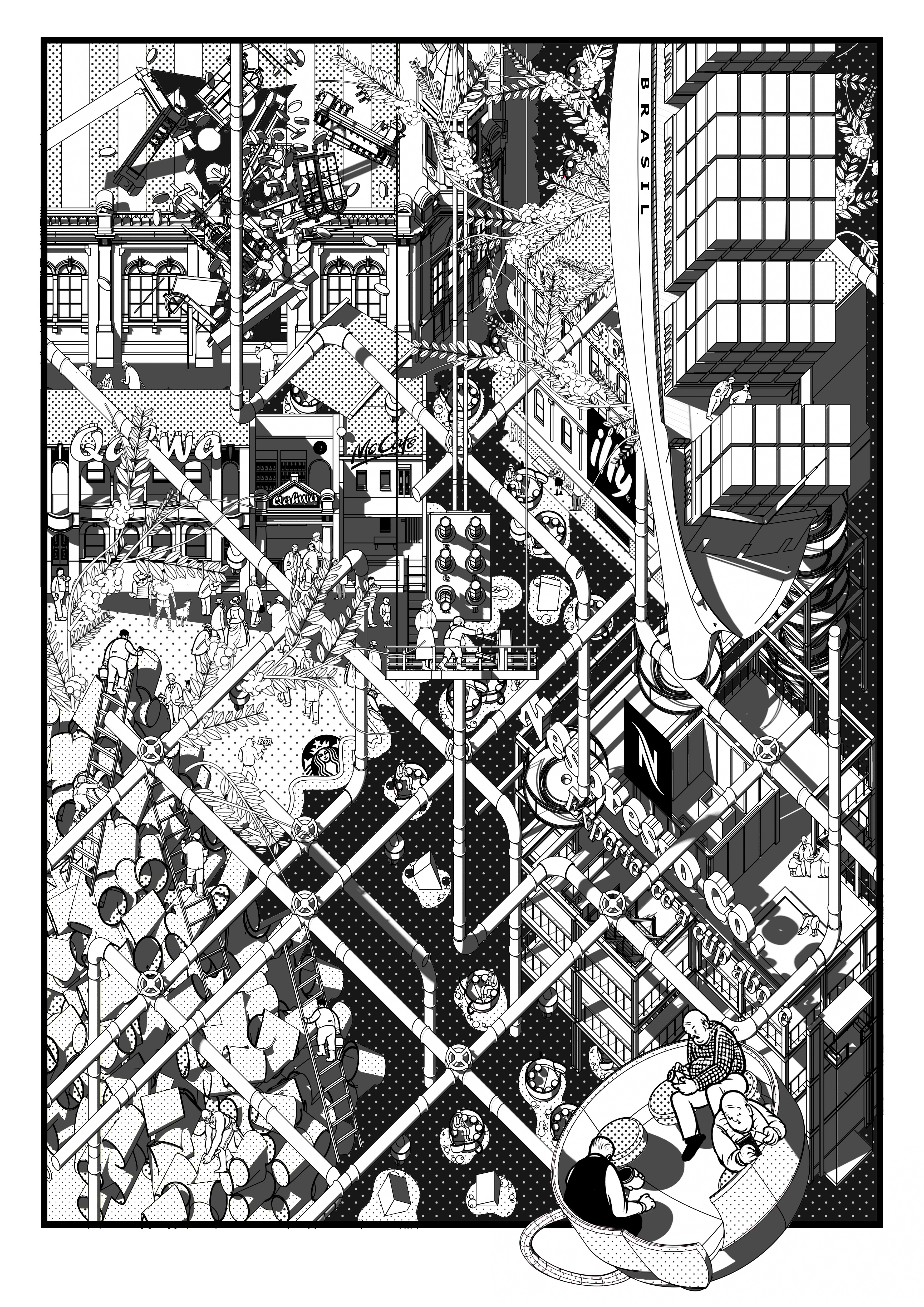 This project, completed in collaboration with my partner and friend Pengcheng Yang, showcases a satirical neighborhood coffee factory design. Through spatial language and narrative, it aims to provoke thoughts about the local food source and provide insights into modern life.